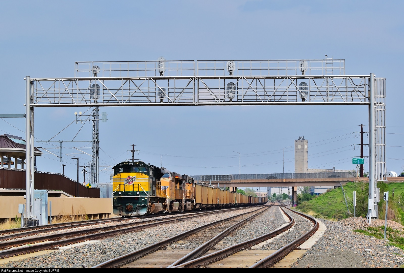| The Chicago Northwestern UP 1995 heritage engine (SD70ACe) is waiting at a signal tower in Denver, Colorado for a crew that will take the empty coal train up the Moffat Tunnel Sub.