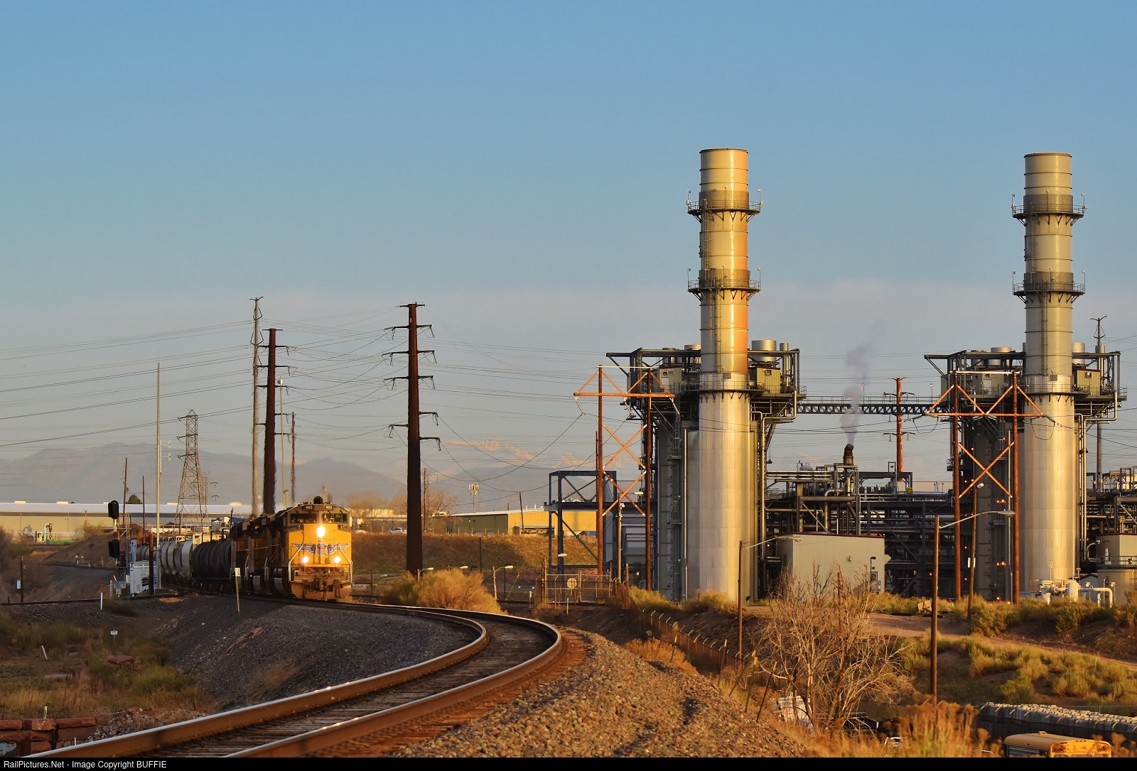 | UP 9013 (SD70ACe) leads a freight into the sunrise as it passes a power plan in northeast Denver, Colorado.
