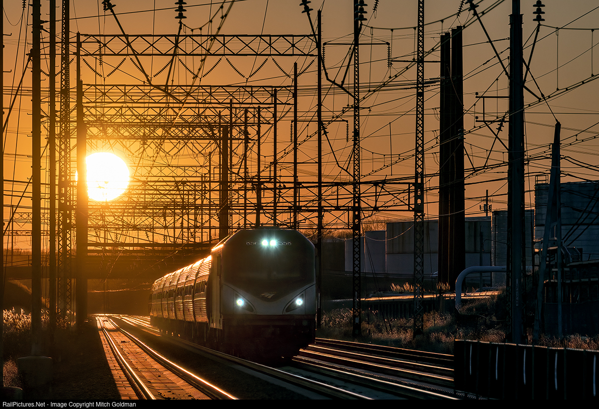 An Amtrak Regional Express makes its way north through Marcus Hook, Pennsylvania, leaving the warmer skies of the South in its evening wake. Philadelphia is the next stop, with an arrival at dusk, while passengers bound for New York and points north will arrive well into the night.