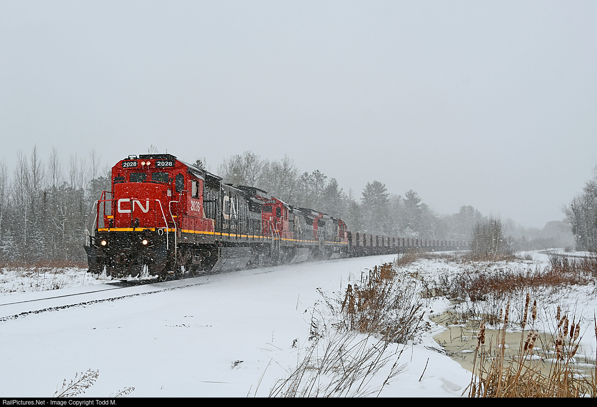 | A snowy trip for the entire 74 miles along the Iron Range Sub is coming to end as CN 2028 is about to cross Highway 7 turning north and getting on the CN Missabe Sub and then the CN Minntac Sub arriving to load pellets before making the return southbound trip back for Two Harbors in, yep, snow. |