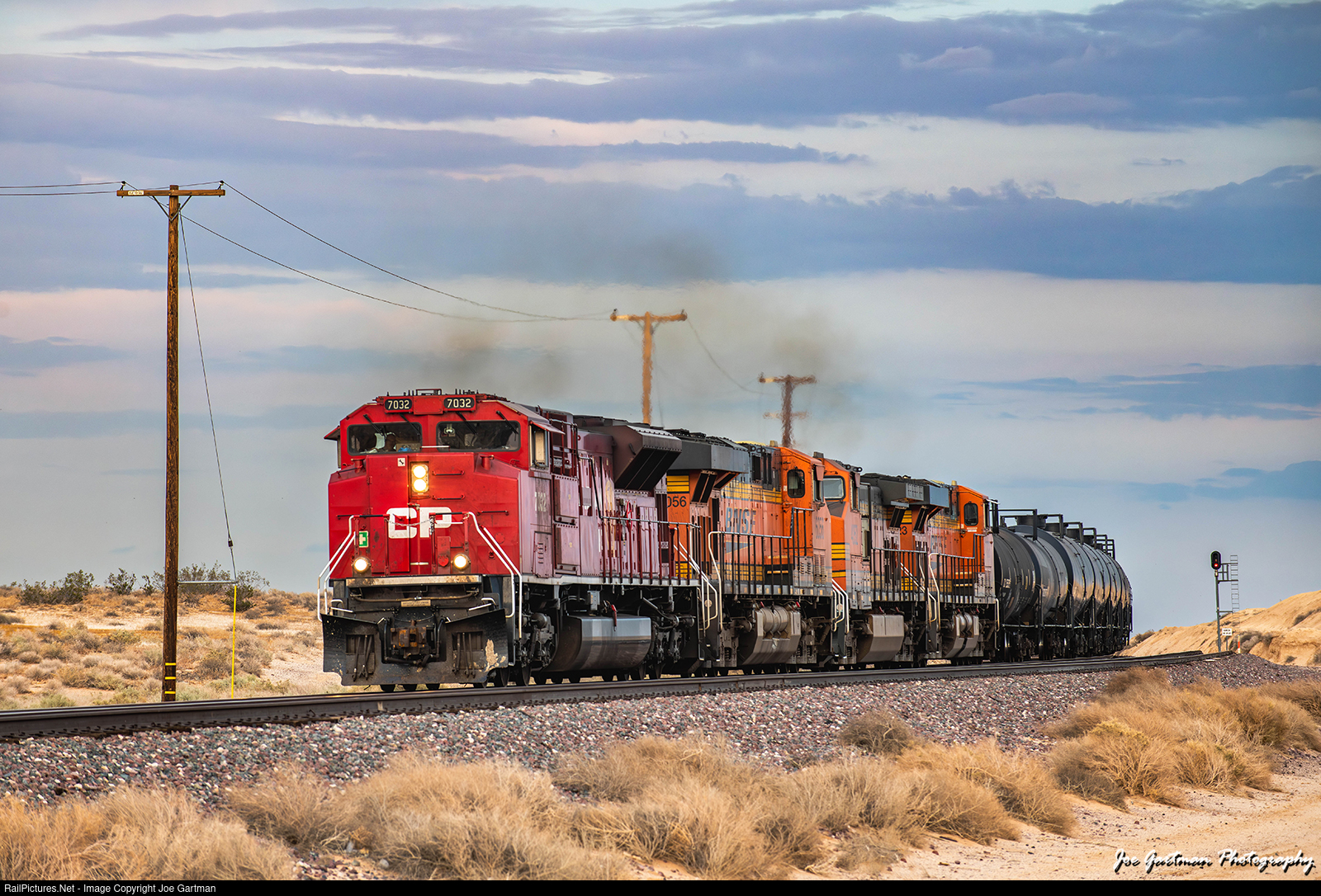 | A long way from home, CP 7032 leads a Westbound oil train through California's Mojave Desert at Jimgrey, 25 miles West of Barstow. |