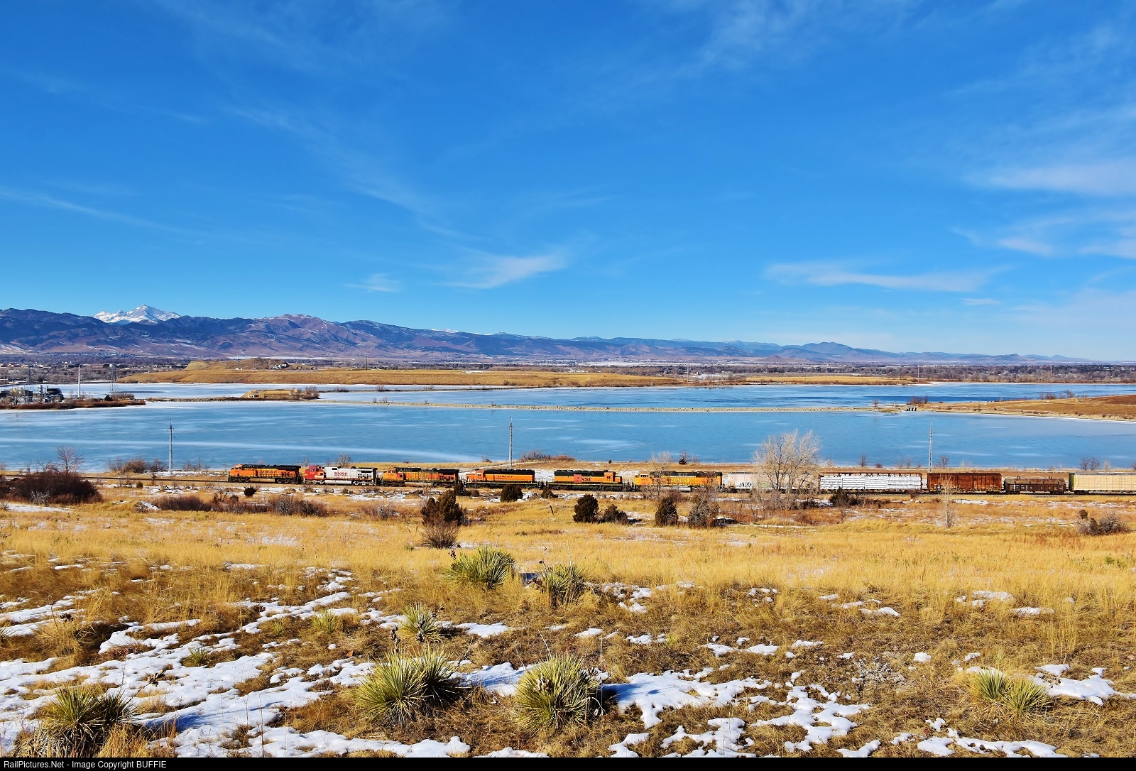BNSF 6847 (ES44C4) leads a power-heavy consist past the cooling ponds of the former Valmont Power Plant in Boulder, Colorado.