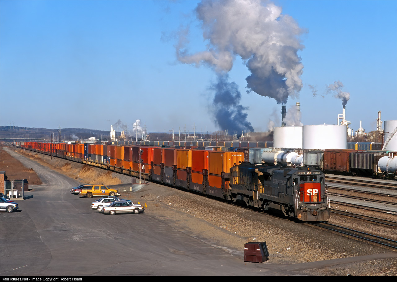 Conrail TV-556 gets underway after a crew change at Selkirk Yard. Southern Pacific power was common on this once-per-week double stack train, but the trailing Santa Fe B36-7 was a nice bonus on a frigid December morning. It's Friday, so the train is running a day late. This power would return north/west the next morning, New Years Eve, on TVLA. The entire length of TV-556 is visible from the vantage point on Ben's Bridge, and from the sea of orange containers it's obvious that this train handled primarily NYK traffic.