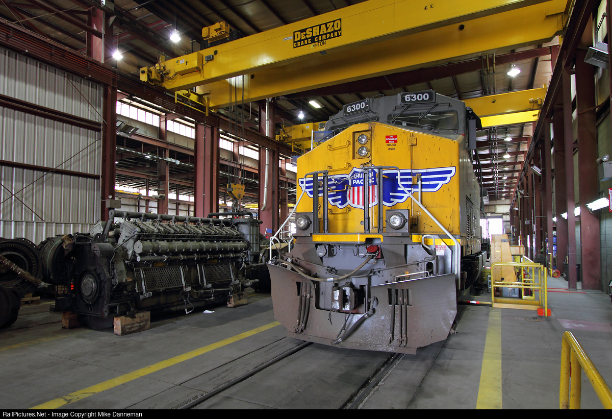 Union Pacific GE AC4400CW No. 6300 is on Track 7 inside the railroad’s South Morrill Locomotive Facility in Nebraska to change out a bad order traction motor on September 14, 2017.