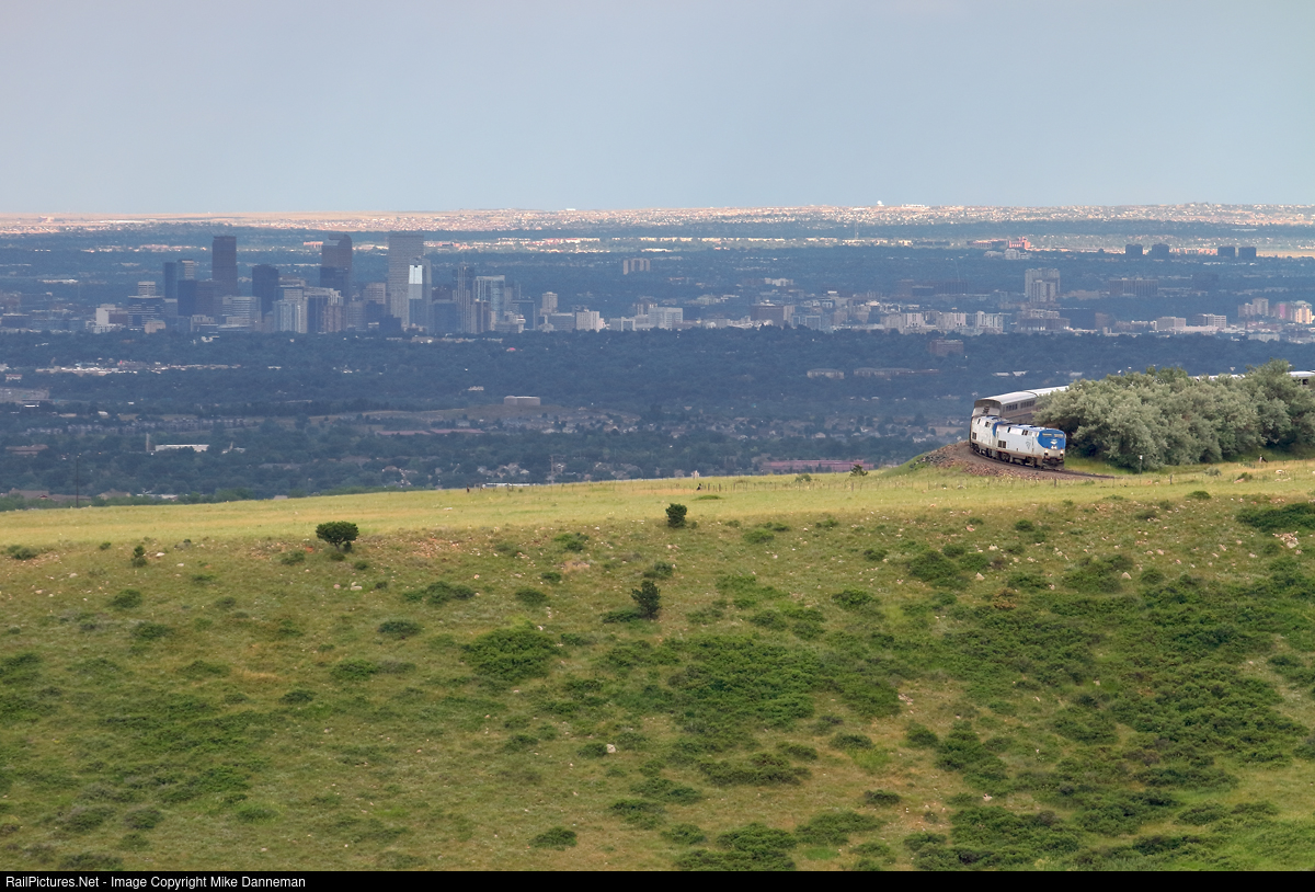 With the city of Denver sprawling out in the plains below, Amtrak’s eastbound California Zephyr rounds Big 10 Curve between Eiesle (Clay) and Rocky, Colorado, while dropping downgrade on Union Pacific’s Moffat Tunnel route on the afternoon of June 20, 2018.