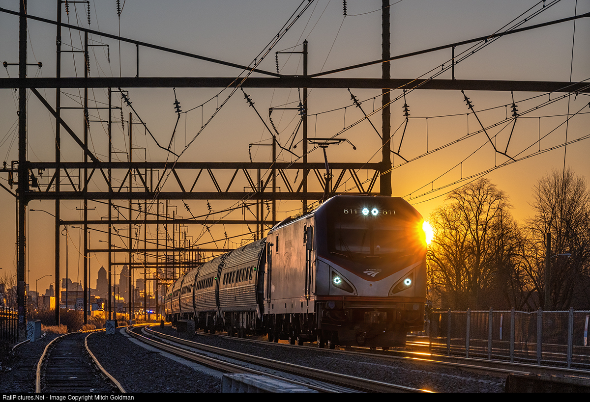 An Amtrak Regional Express, led by AMTK No. 611, charges east through the Tacony section of Philadelphia, racing the Sun as it makes its way towards Trenton, NJ and points north. The city skyline can be seen in the background, to the left.