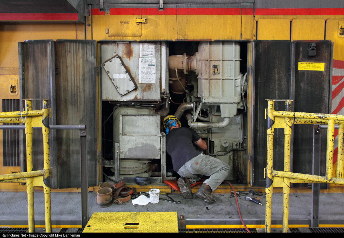 It takes some dexterity and flexibility to install a new water pump inside Union Pacific GE AC4400CW No. 6227 inside the locomotive shop South Morrill, Nebraska, on September 15, 2017. Due of the substantial decline in coal tonnage, unfortunately, this overhaul and repair facility was closed in January 2019.