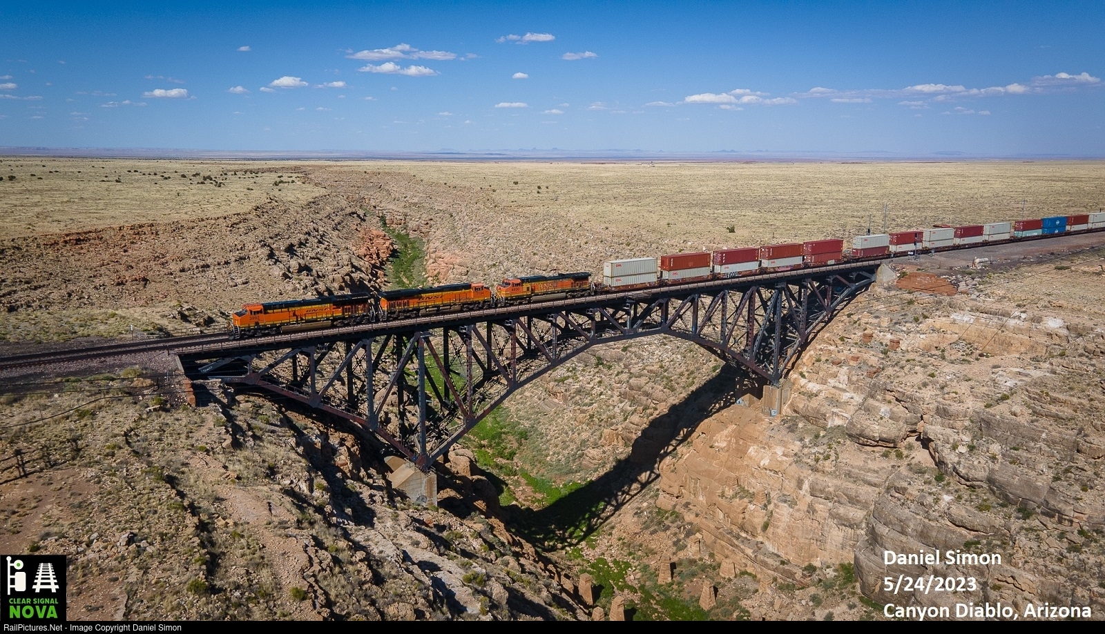 An intermodal train crosses the stunning Canyon Diablo bridge heading west on the BNSF Segliman Subdivision.