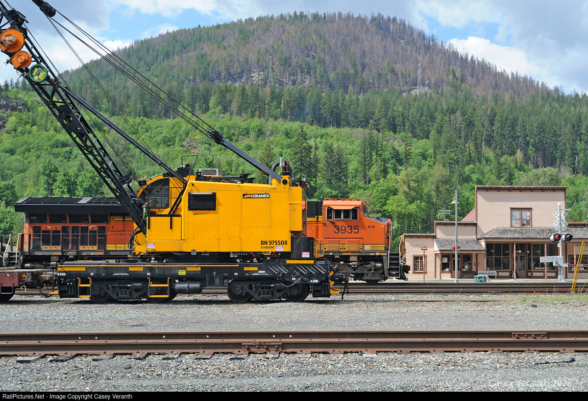 | The town of Skykomish and the BNSF continue to rebuild and upgrade infrastructure after last year's fire, evidence of its damage can be seen on the hill in the background. Locomotive crane BN 975508 has been used mostly as a pile driver. In the near background is an eastbound empty coal led by BNSF 3935. |