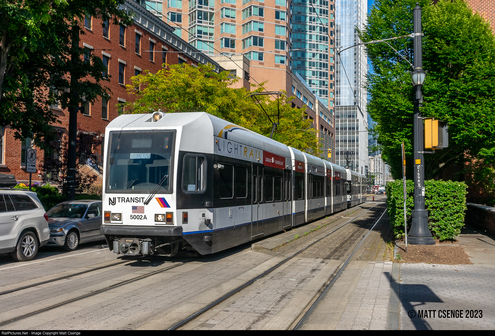 NJ Transit 5 Section LRV 5002 (Kinki Sharyo, 2014-2016) is the lead unit on a Bayonne Flyer service heading south on the Hudson-Bergen Light Rail. The train is seen on Essex St in Jersey City, where southbound trains run in the traffic lane and northbound trains run on their own dedicated lane on the otherwise one-way street. The dense foliage along the street means that sunlit shots of the train are only available in a brief window in late spring and early summer! |