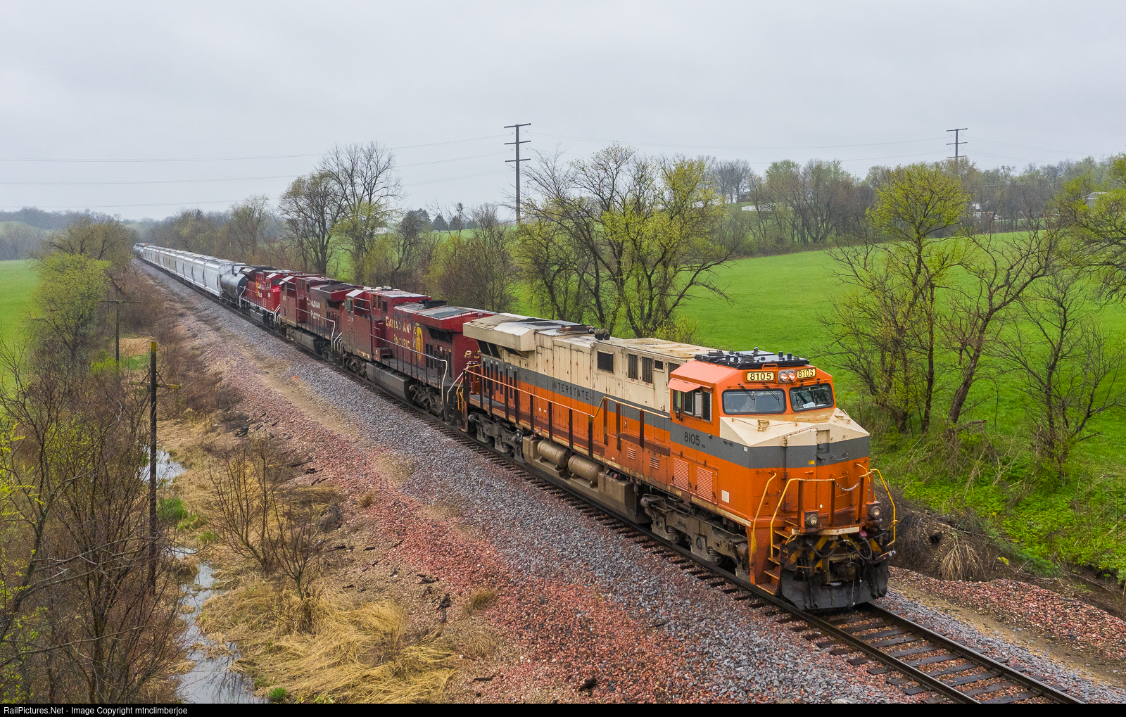 | A rainy morning in Ottumwa, Iowa finds Canadian Pacific's train 261 tied down just outside of the yard, the crew having run out of hours before they could yard the train. On the point of the Kansas City to St. Paul manifest is Norfolk Southern's Interstate heritage unit leading three other CP locomotives. |