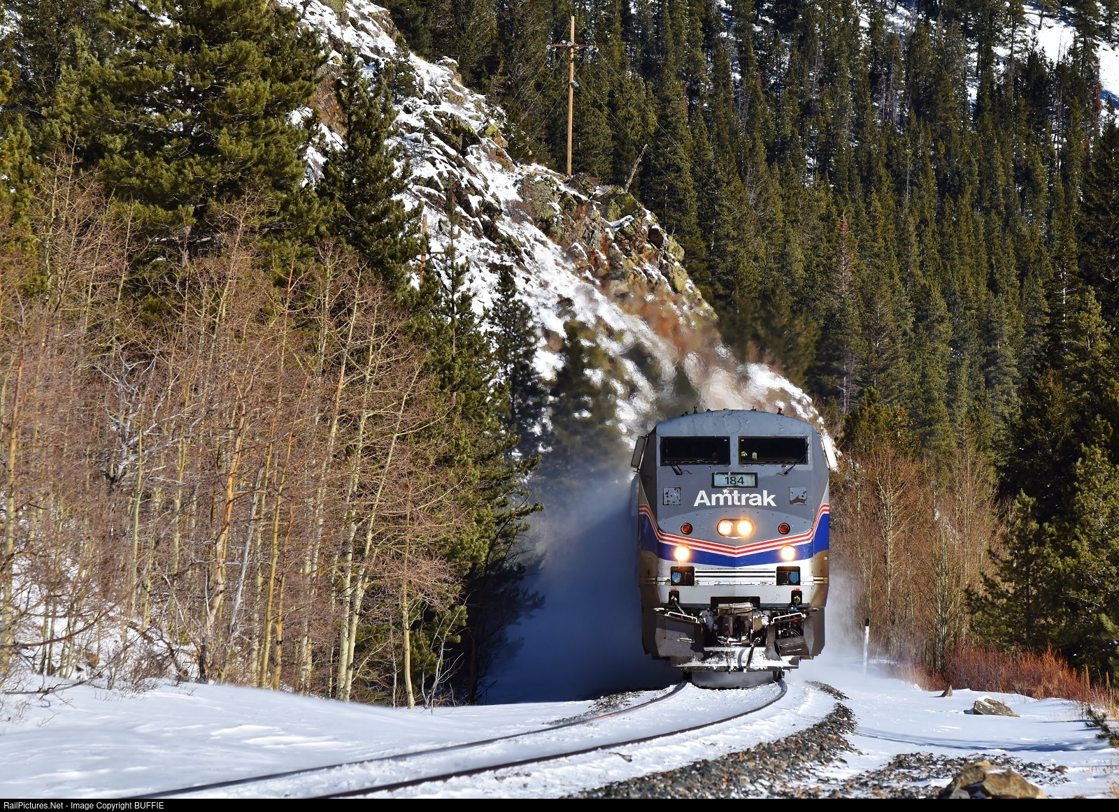 Amtrak heritage engine #184 (P42DC) kicks up the snow as it runs through the trees at Tolland, Colorado.