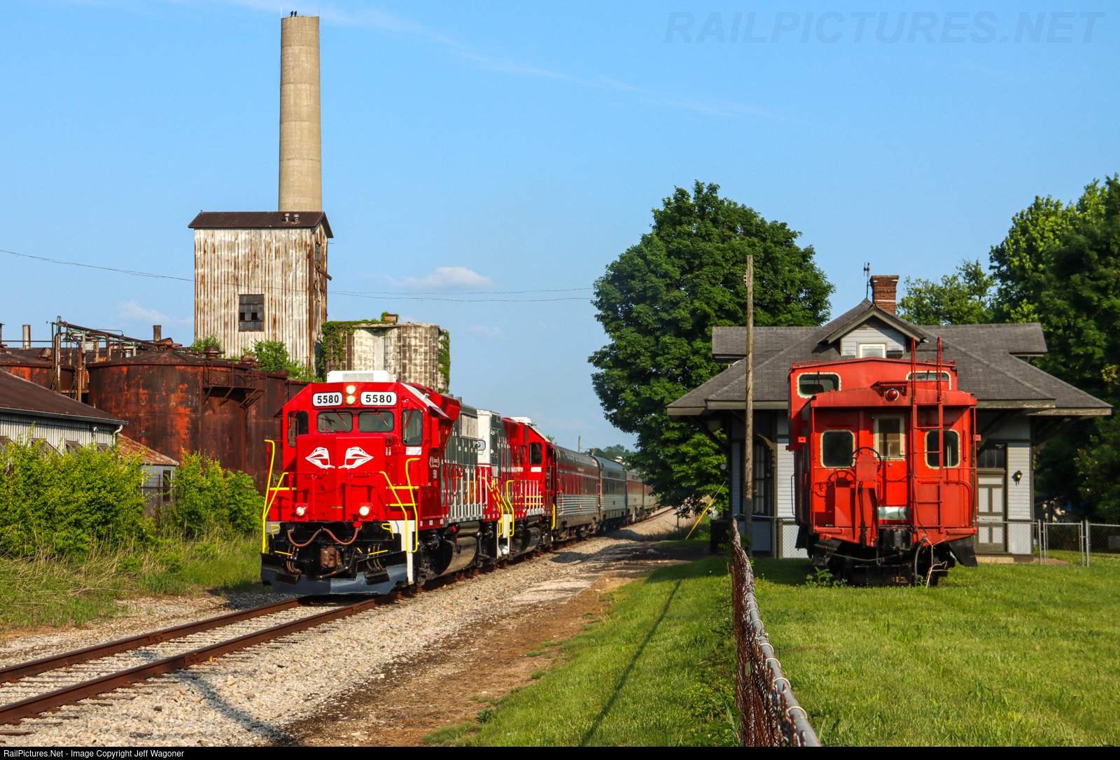 | R.J. Corman's two 50th Anniversary Geeps pull R.J. Corman's My Old Kentucky Dinner Train north at Deatsville, temporarily replacing the FP7s normally tasked with this run. |
