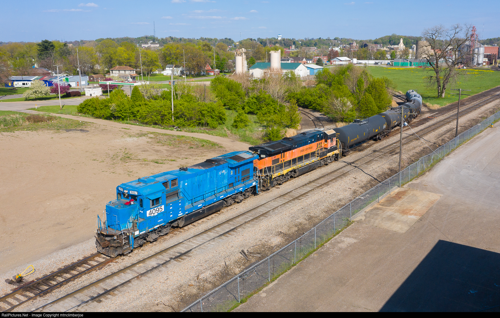 | A pair of Ohio Central Super 7's work the ZVL-1 job as they spot their cars in Zanesville, Ohio after returning from Cambridge. The crew is shoving five tank cars up the OHCR Subdivision where they will be set for pickup by the local to Newark later on. |