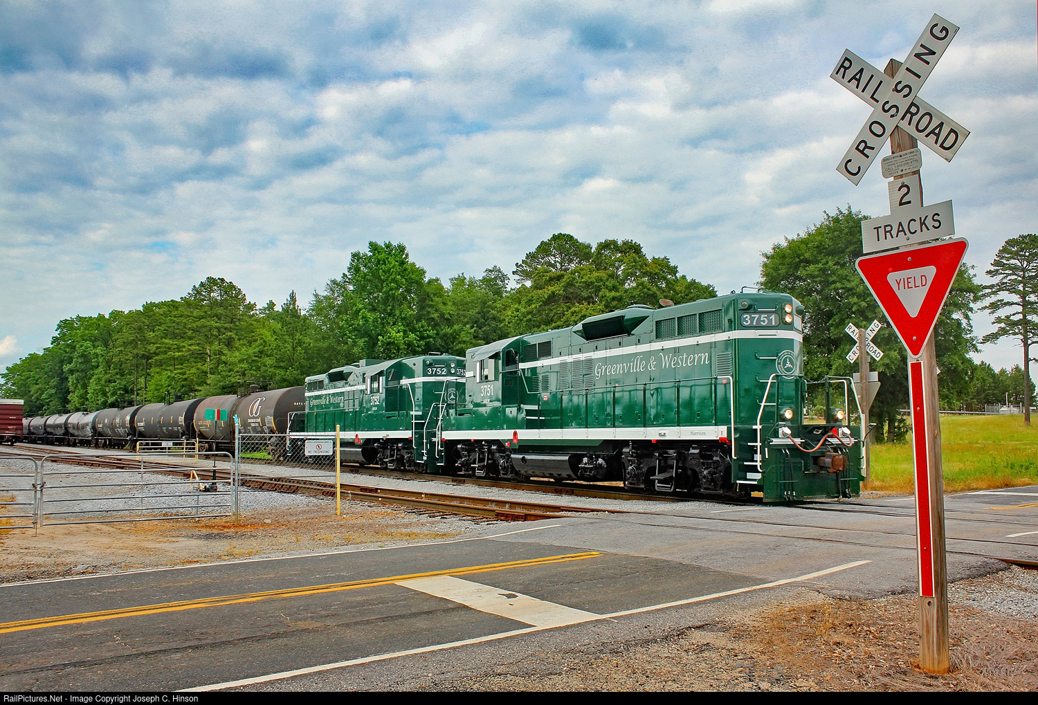 | Greenville & Western Tailway crew works the ethanol facility at Cheddar, South Carolina in June of 2014 with two locomotives built for the Baltimore & Ohio. GRWL 3751 She was built as Baltimore & Ohio 6513 in 1957 and later became East Cooper and Berkeley Railroad 6513. Once on new rails, the railroad gave her a new number and new paint. |