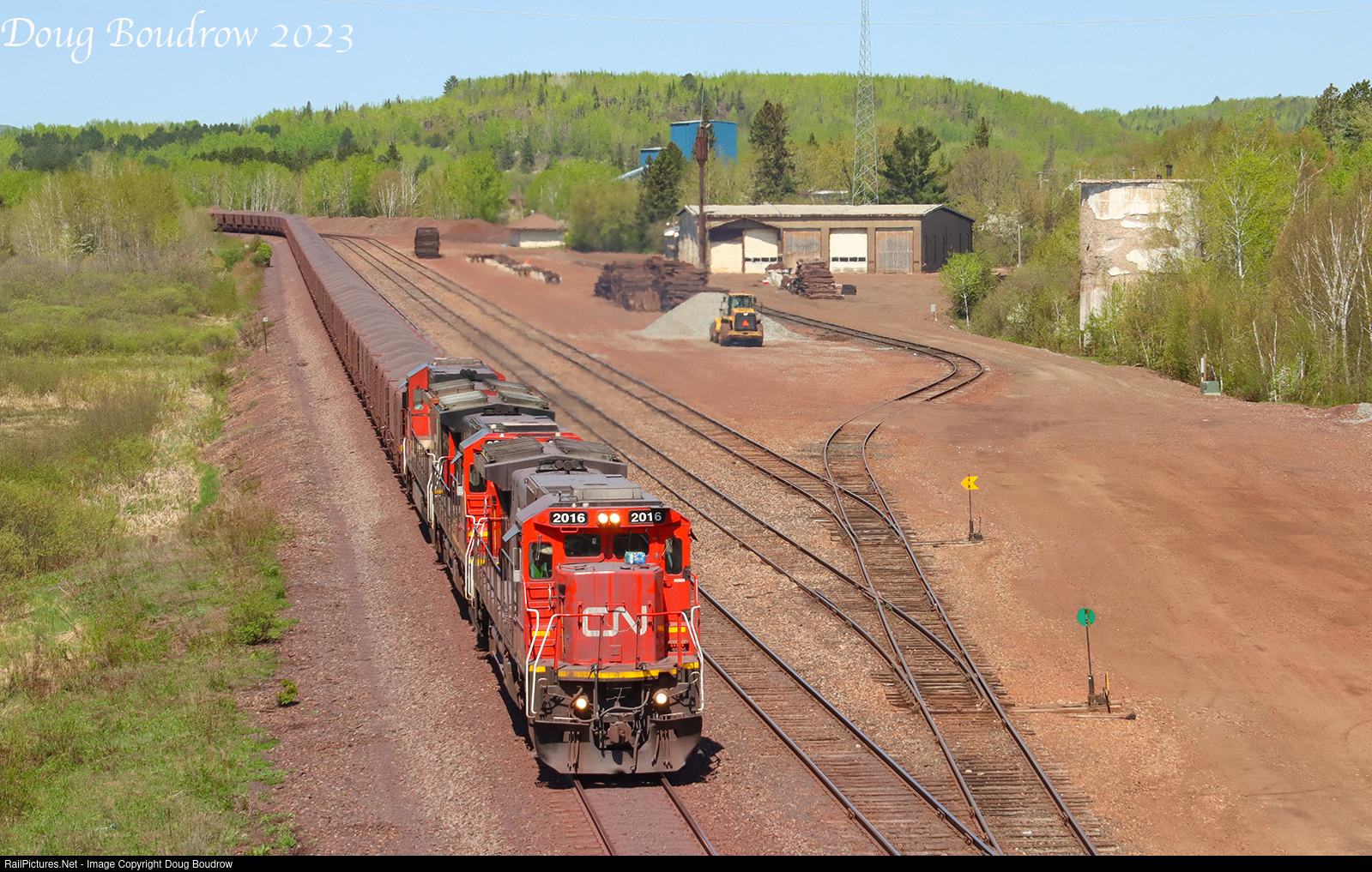 | Loaded taconite pellet train U789 is headed for Two Harbors on the Iron Range Subdivision. The train is passing through Biwabik and the remains of the DMIR yard and engine facilities that were once located in this small town. |