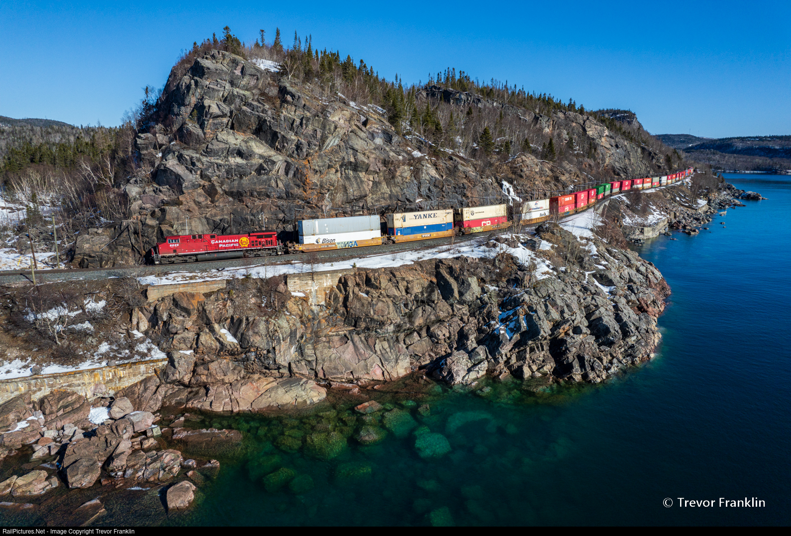 | Transcon stacks snake along Lake Superior's north shore on an early winter morning, shot from an angle I was finally able to get after scouting for a long time. Just around the corner is the location of the Red Sucker Tunnel along with Red Sucker Cove to the frame's right and Red Sucker Point Provincial Nature Reserve off in the distance. Persistence is often the name of the game in these parts, and I was really happy with the way this scene ended up coming together. |