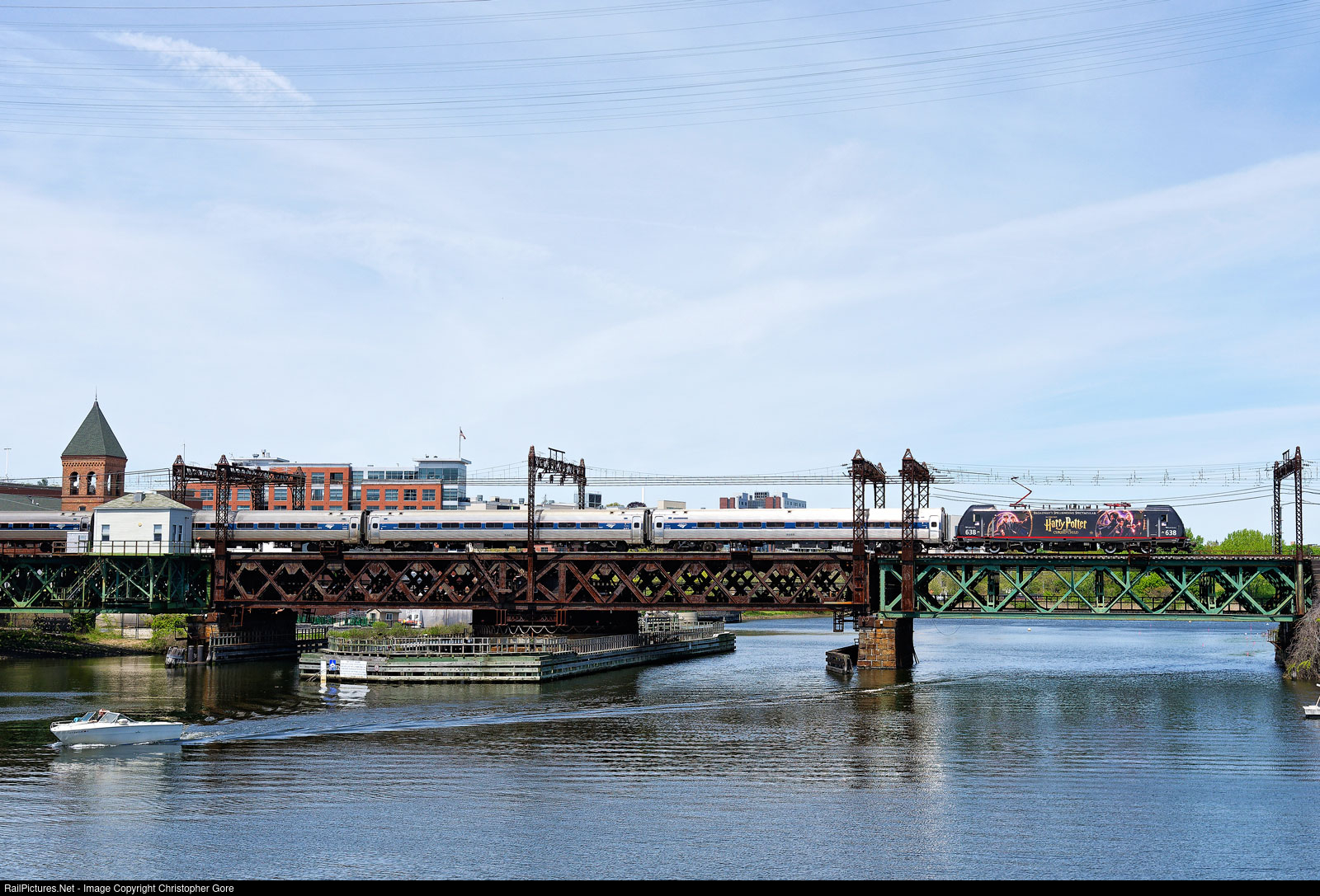 | Amtrak's Harry Potter wrapped, ACS-64 638, leading Vemonter across Walk Bridge in Norwalk. |