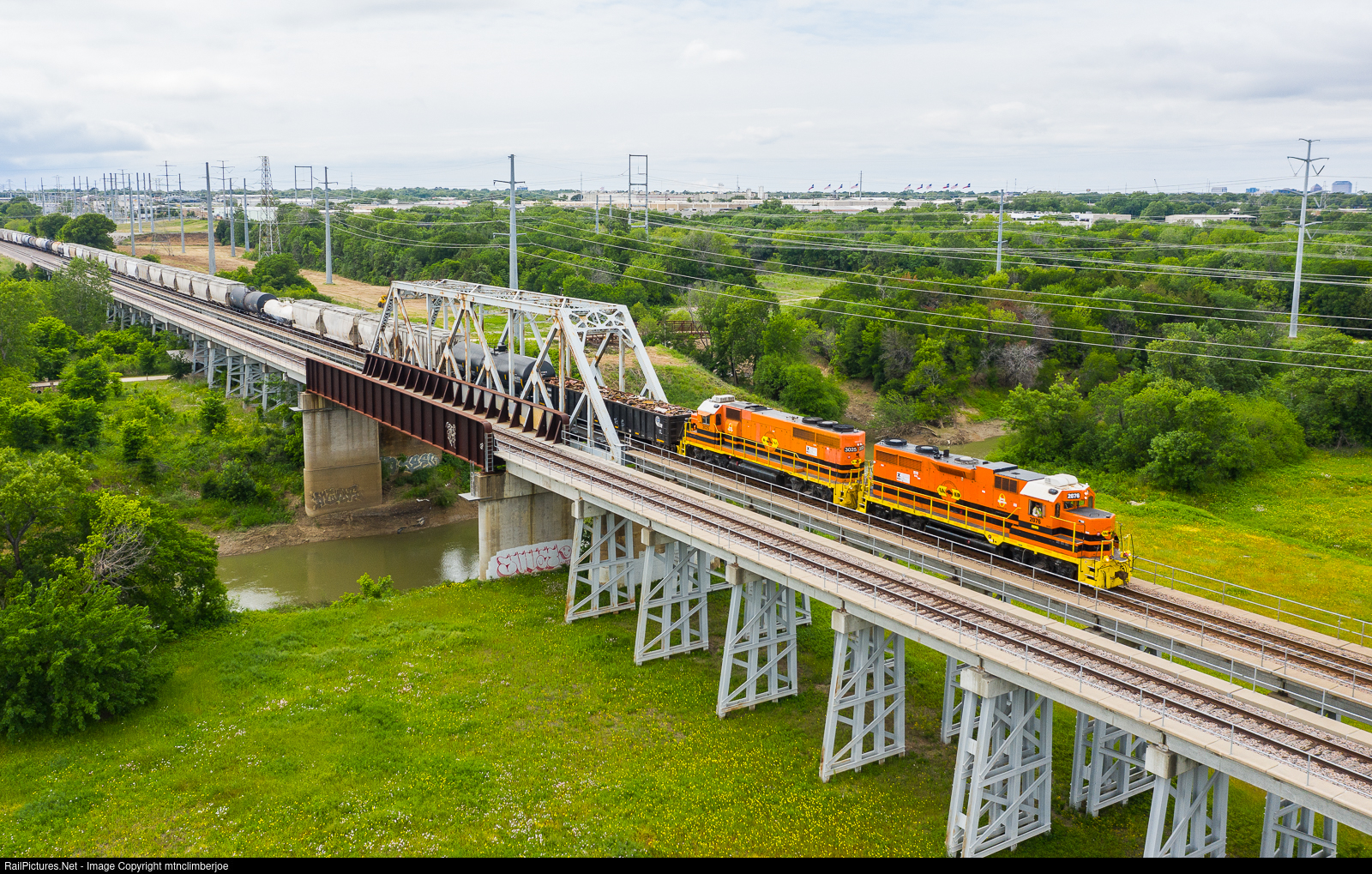 | The Dallas, Garland & Northeastern Railroad's Dallas Turn heads east on the TRE's DFW Subdivision as it returns from the BNSF interchange in Irving and heads back to Mockingbird Yard. An AKMD GP38-2 and an MNA GP40-3 power the train as it crosses over the Trinity River on a long steel trestle in West Dallas, Texas. |