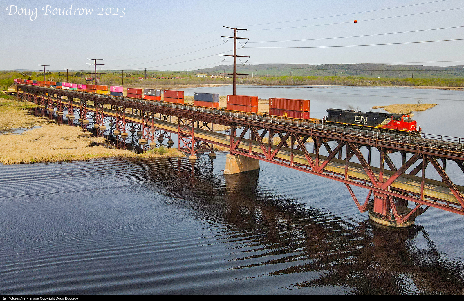 A double-stack intermodal train is seen crossing the Saint Louis River from Minnesota into Wisconsin at Oliver. The bridge is double-deck with the railroad on top and Highway 2 on the bottom.