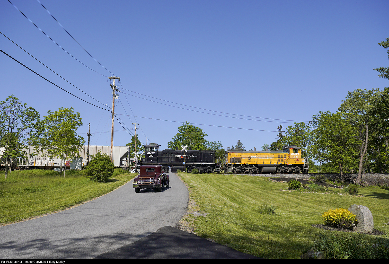 An antique car stops at a crossing for the Finger Lakes Railway's Watkins Glen turn. The car could not wait and backed up down the hill.