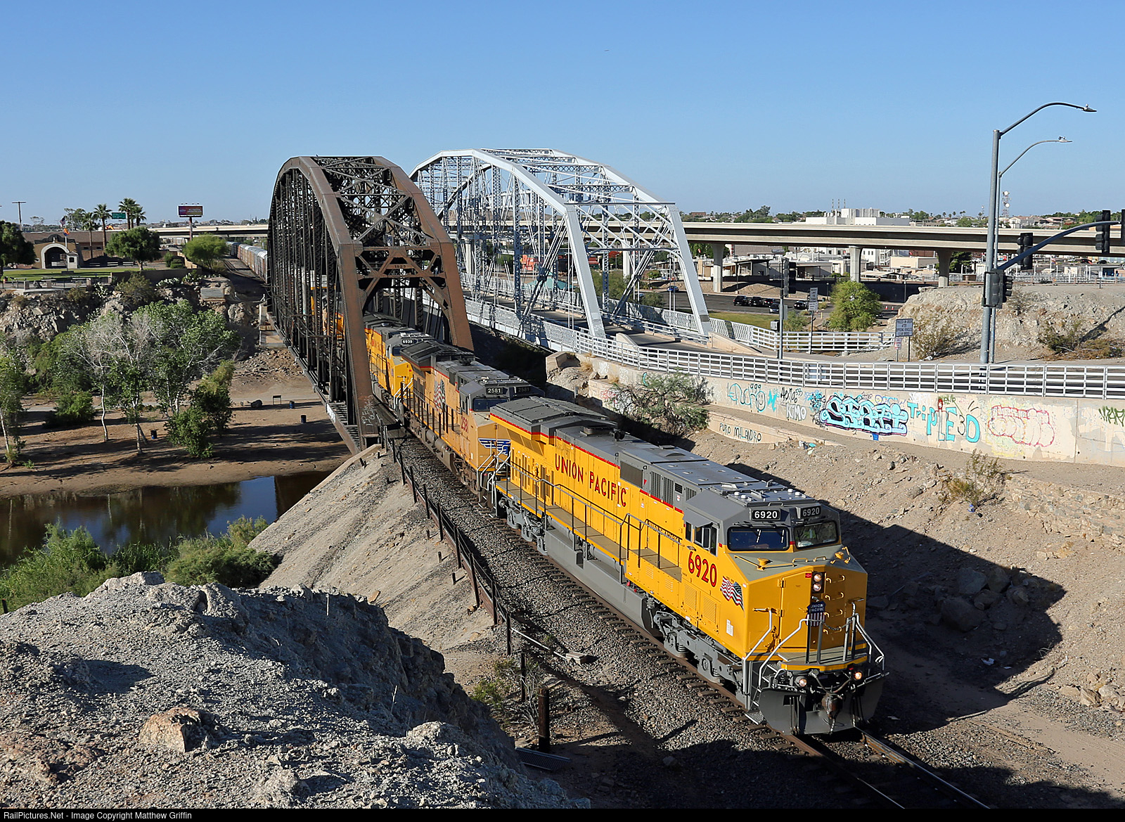 Brand new C44ACM #6920 leads a westbound MTUWC across the Colorado River as it departs Yuma.