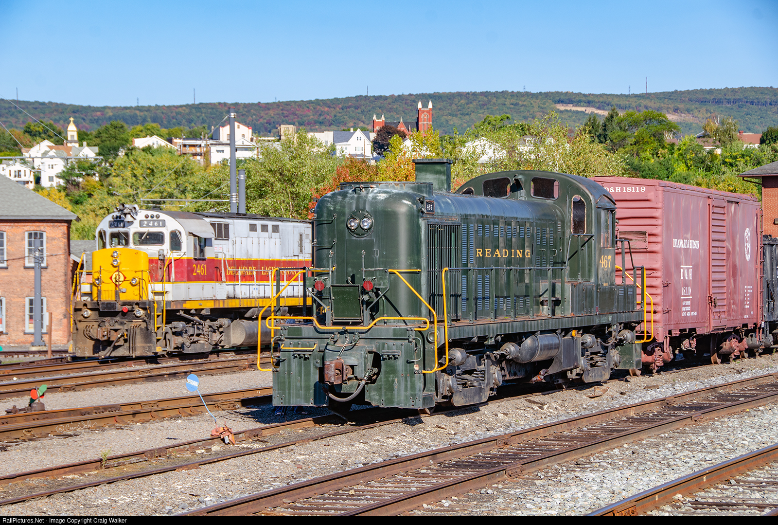 Reading Company RS-3 467, built by the American Locomotive Company in May 1952, was sold to the Peabody Coal Company. It was later purchased – and restored – by the Reading Historical Society. This engine is stored at the Steamtown National Historic Site, and is often displayed with freight cars of the same era, as seen here on a crisp early autumn morning. In the background is power belonging to the Delaware-Lackawanna Railroad, with DL C-425 2461 (ex-DL 811, ex-BCOL 811, originally EL 2461) coupled to three other ALCOs. (Scranton, Pennsylvania – September 29, 2013)