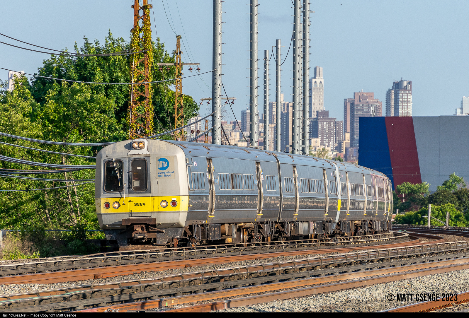 Long Island Rail Road (LIRR) M3 car no. 9884 (Budd Metropolitan, 1984-1986) is the lead unit on eastbound train 5706, a deadhead run from NY Penn Station to Far Rockaway, seen approaching Woodside Station during the morning peak period.