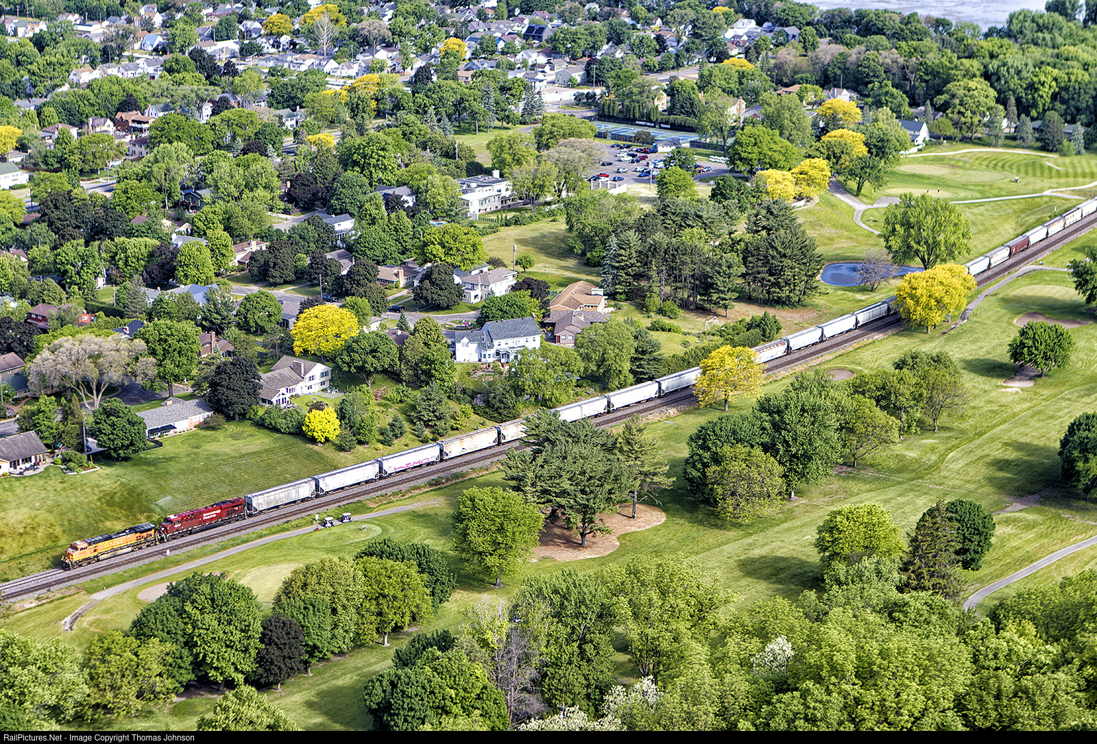 Golfers enjoying their morning round are distracted by the BNSF grain train.