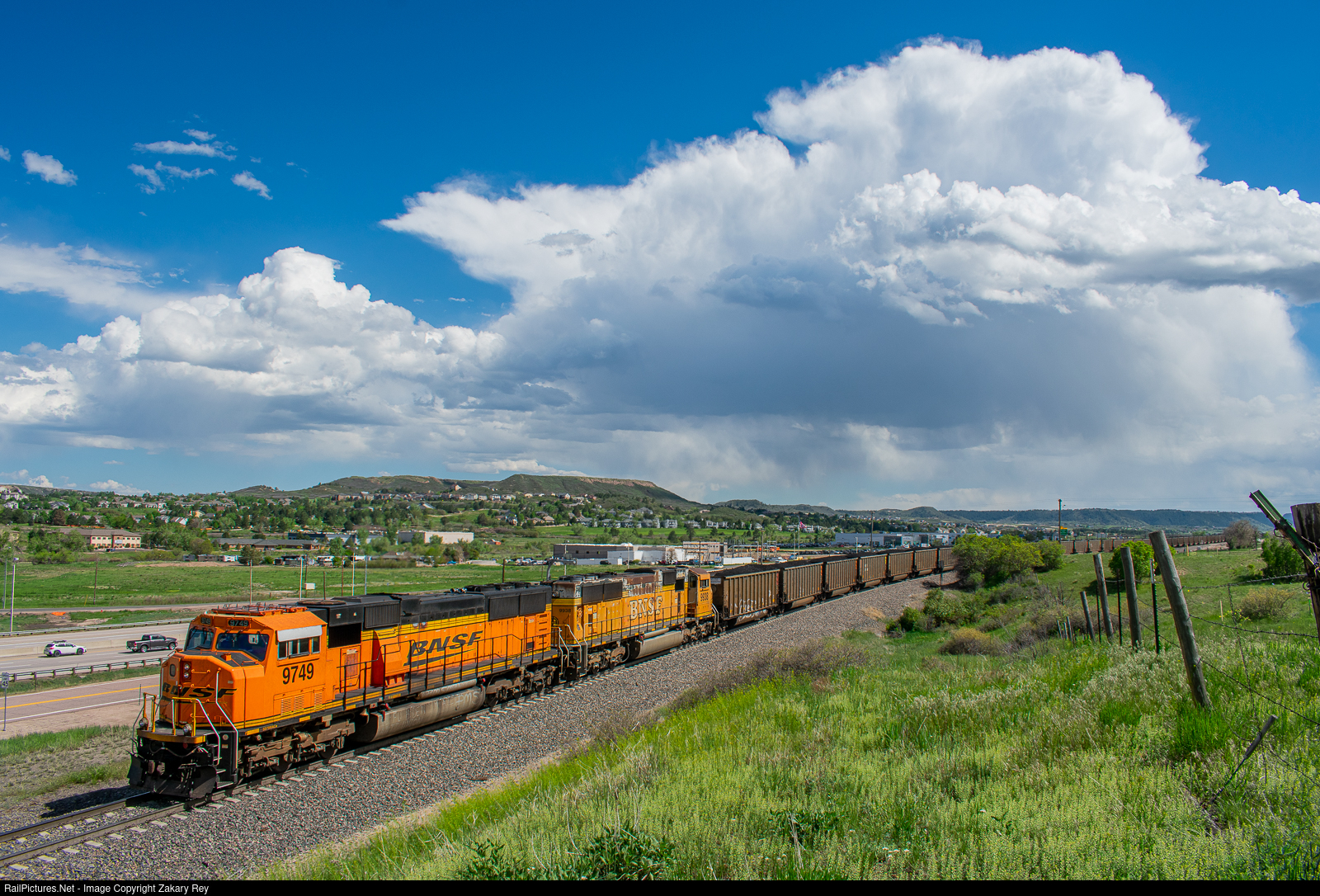 This particular Rawhide Mine, WY to Smithers Lake, TX coal train had an eclectic variety of early BNSF-era power, which included an SD70MAC leader and this DP set, which included another SD70MAC and this SD70MACe rebuild on the rear. Seen here passing through Castle Rock as late-Spring thunderstorms begin to build over the Southern Rockies