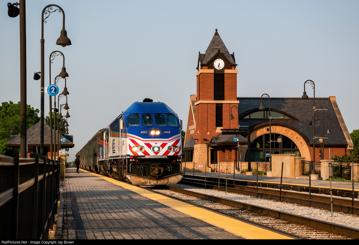 | Painted to commemorate the state of Illinois, this Rock Island line outbound is powered by the one and only 402. Captured here at Tinley Park’s 80th ave station amidst a thin layer of Canadian wildfire smoke. |