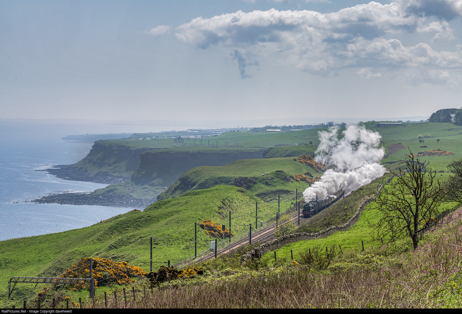 | After crossing the Border bridge at Berwick, the train had to wait for a couple of service trains to pass before it could continue to Edinburgh. North of berwick it runs close to the north sea as it crosses into Scotland |