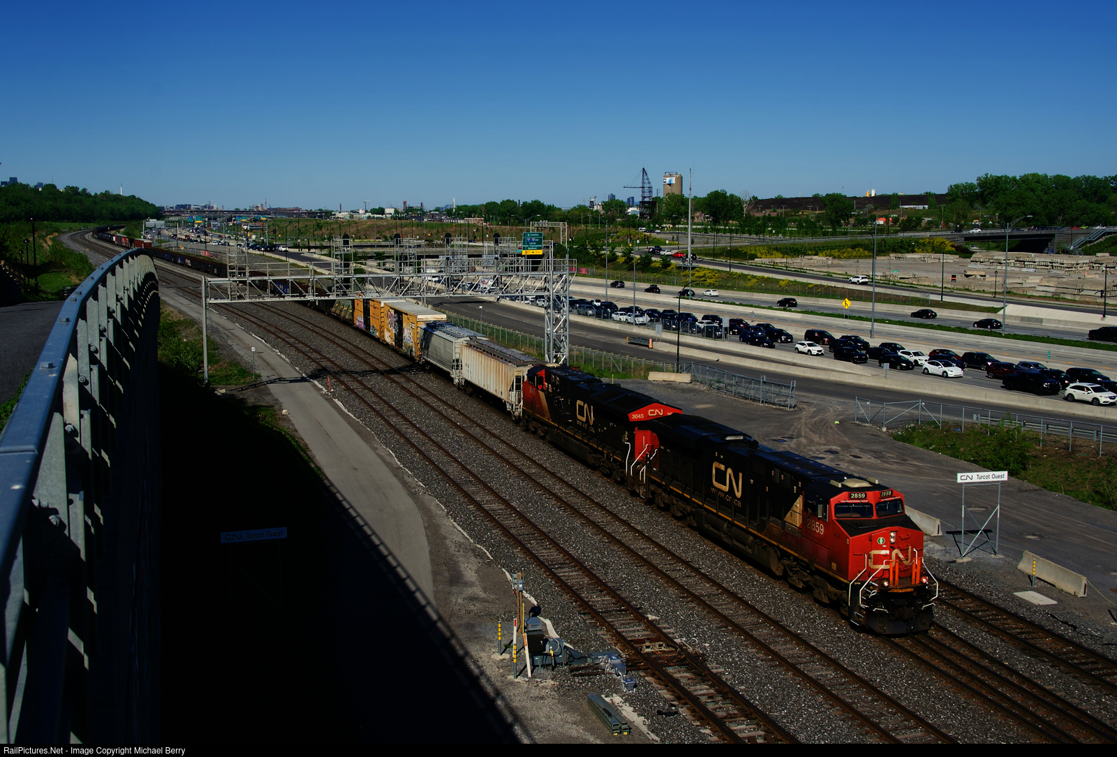 | With traffic at a standstill on the Autoroute 20 (it is completely closed in the westbound direction up ahead), CN 321 passes Turcot Ouest with CN 2859 & CN 3045 for power. CN 2859 unusually has orange grab irons on the nose. |