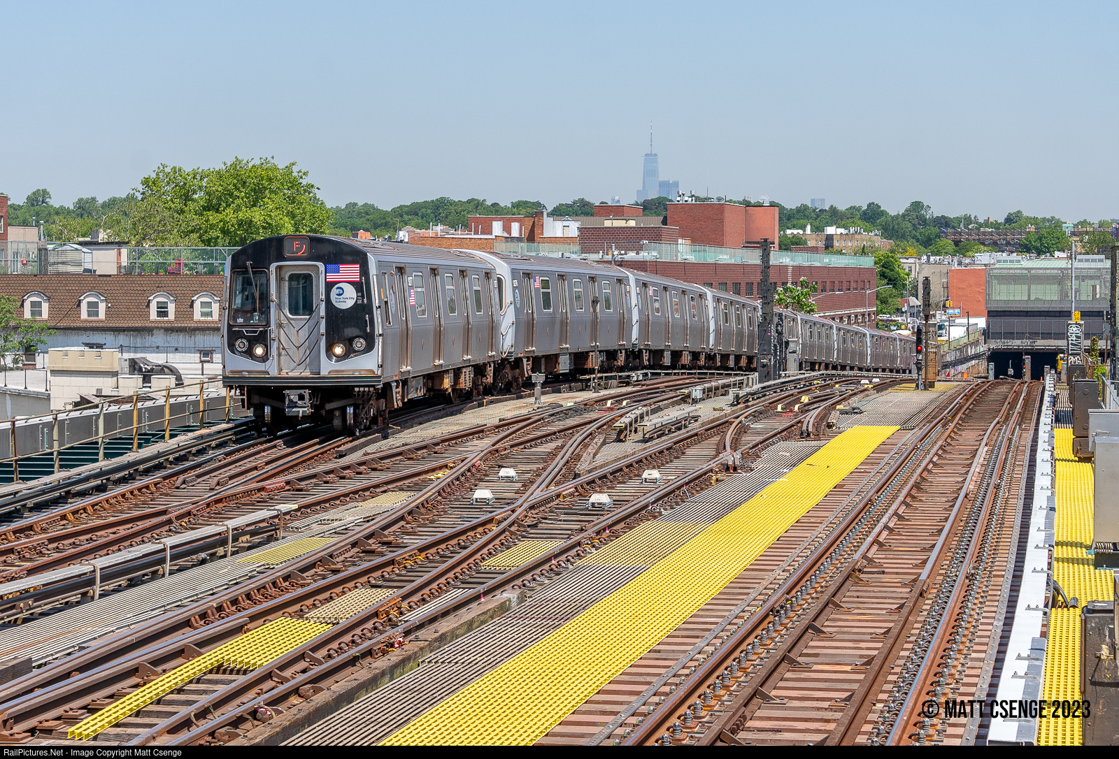 New York City Transit Authority (NYCTA) R160A no. 9277 (Alstom, 2005-2010) is the lead motor on a Coney Island-bound F train seen rising up onto the Culver Line structure as it approaches Ditmas Ave Station. The interlocking at this location was built by the IND when they extended their four-track South Brooklyn Line and "recaptured" the three-track BMT Culver Line, which originally curved west here towards 9th Ave Station on the BMT West End Line. The interlocking is currently being reconfigured as part of the Culver CBTC project, and the five switches merging the four tracks into three will soon be only one: where the two express tracks merge into one. This work has finally begun after lengthy delays with the manufacture of the Special Work Portions (SWPs) for this project: the Manhattan-bound local track B2 has been "hard railed" and its switch removed. The operational flexibility will not be lost, though; crossovers allowing moves between the express and local tracks have been added within the tunnel, sheltering them from the elements and reducing the chance of delays due to snow in the winter.