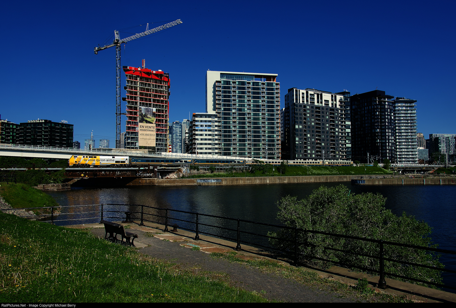 VIA 63 has VIA 920 and five LRC cars as it passes a wall of condos by the Peel Basin.