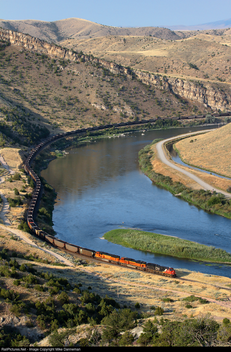 Canadian National GE ES44DC No. 2284 leads a pair of BNSF EMDs on a westbound BNSF coal train from Powder River Basin heading for Roberts Bank, British Columbia, on Montana Rail Link’s main line through Lombard Canyon at Toston, Montana, on the morning of September 12, 2011.