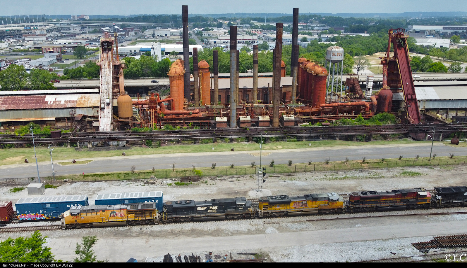 An NS manifest train heads through Birmingham past the Sloss Furnaces.
