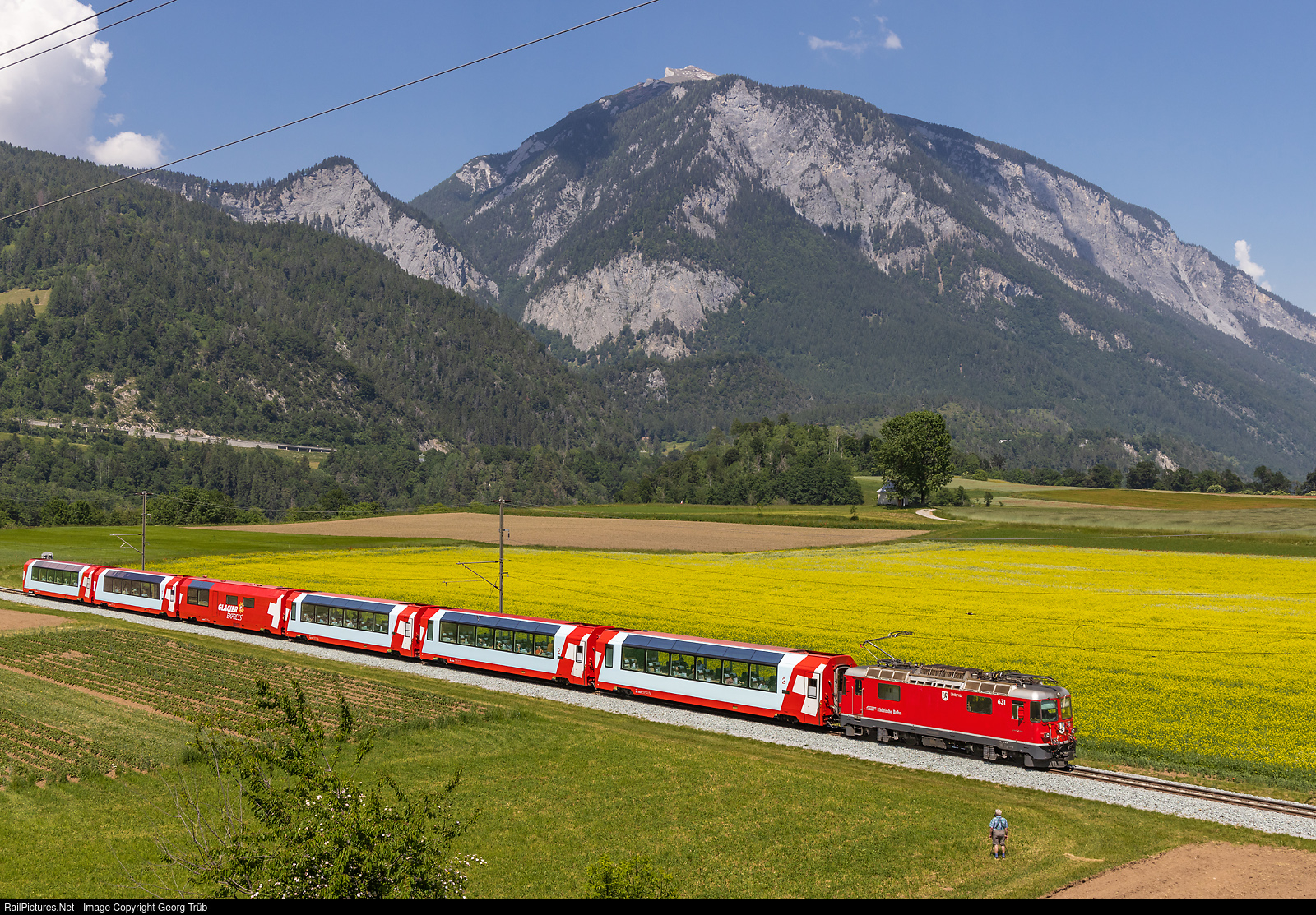 Ge 4/4 II # 631 of the Rhaetian Railway pull the PE 902 GLACIER EXPRESS Zermatt-Brig-Andermatt-Disentis-Chur-Albula-St.Moritz, on the lap between Chur and St.Moritz, between Reichenau-Tamins and Bonaduz. Train enthusiast Ernst of Fidaz is shooting a video of the train.