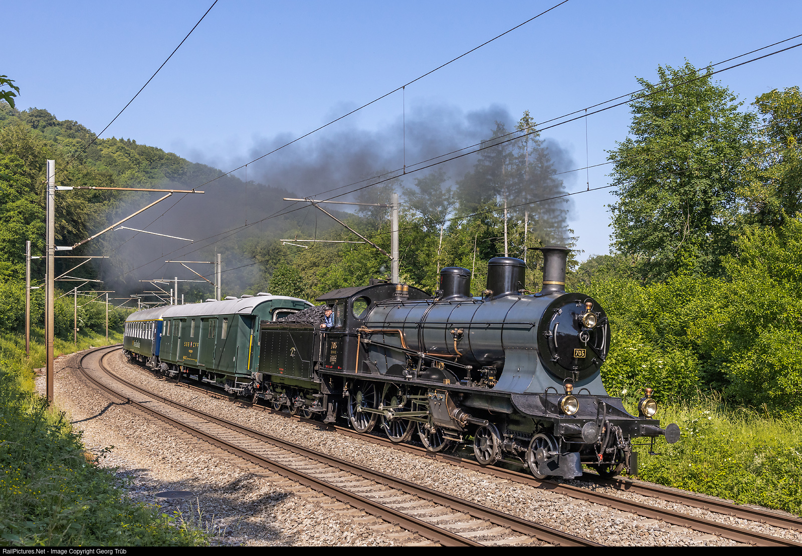 | Express train steamlocomotive A 3/5 # 705 of SBB Historic, built in 1904 by the SLM, nowadays on long term loan to the steam group Zürich (Verein Dampfgruppe Zürich VDZ), is storming up the 1.2 % grade between Turgi and Baden with the international special 31745 of RailEvent from Brugg AG via Regensdorf-Bülach-Schaffhausen-Stein am Rhein-Kreuzlingen to Konstanz/Germany. |