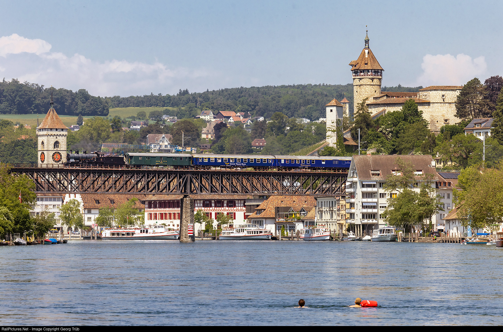 Express train steamlocomotive A 3/5 # 705 of SBB Historic, built in 1904 by the SLM, nowadays on long term loan to the steam group Zürich (Verein Dampfgruppe Zürich VDZ), is crossing the Rhine river between Schaffhausen and Feuerthalen with the international special 31745 of RailEvent from Brugg AG via Regensdorf-Bülach-Schaffhausen-Stein am Rhein-Kreuzlingen to Konstanz/Germany. On the right the Munot, a circular 16th century fortification, which serves as the city's symbol.