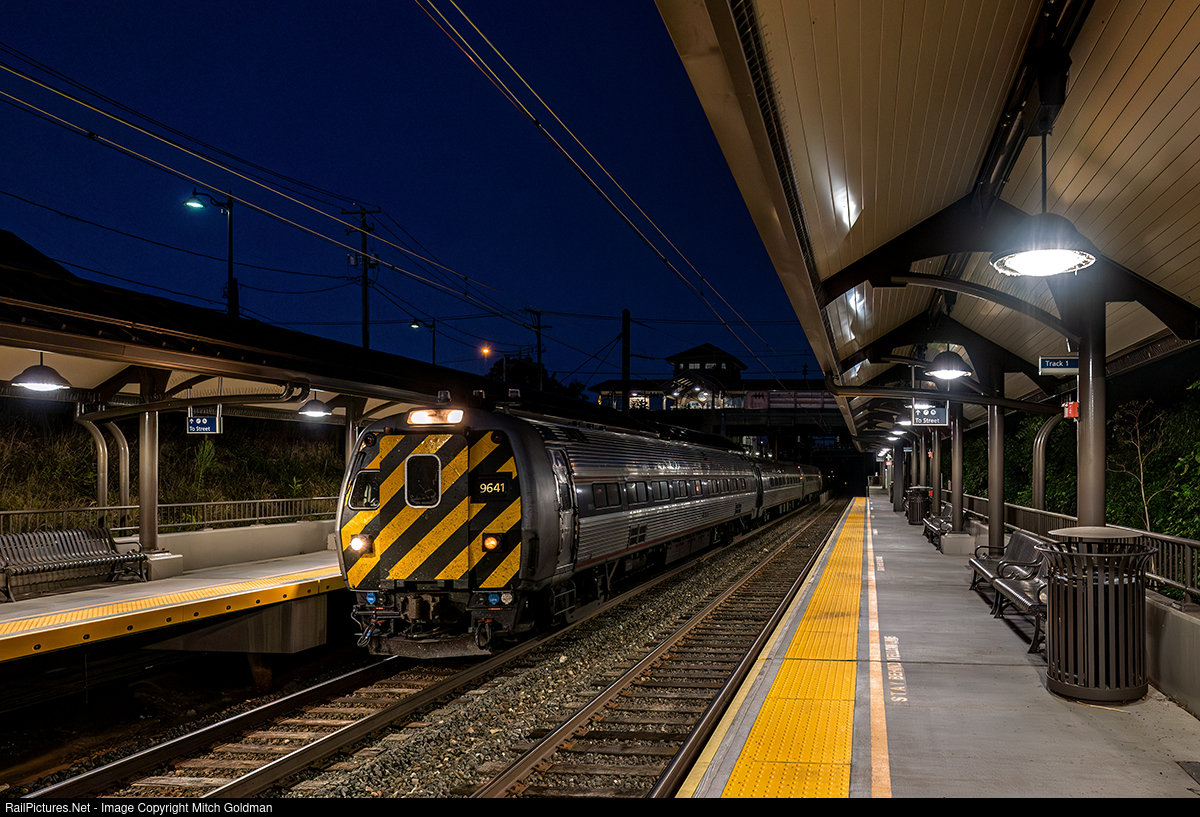 An Amtrak Keystone train, led by a Metroliner cab car, arrives at the recently renovated Mount Joy station in Pennsylvania. Next stop, Harrisburg.