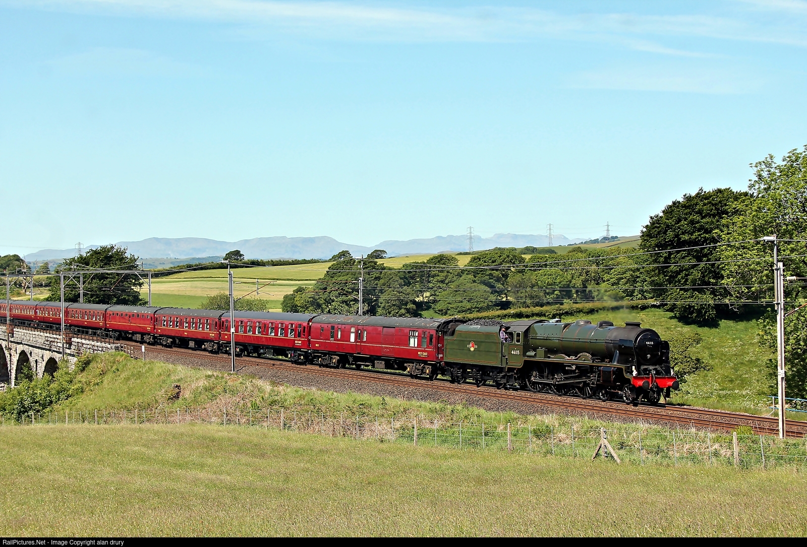 Stanier LMS class 7P Royal Scot 46115 SCOTS GUARDSMAN has just crossed Docker Viaduct with 1Z86 06.48 London Euston to Appleby The Cumbrian Mountain Express steam on from Carnforth. unfortunately no exhaust because of hot weather