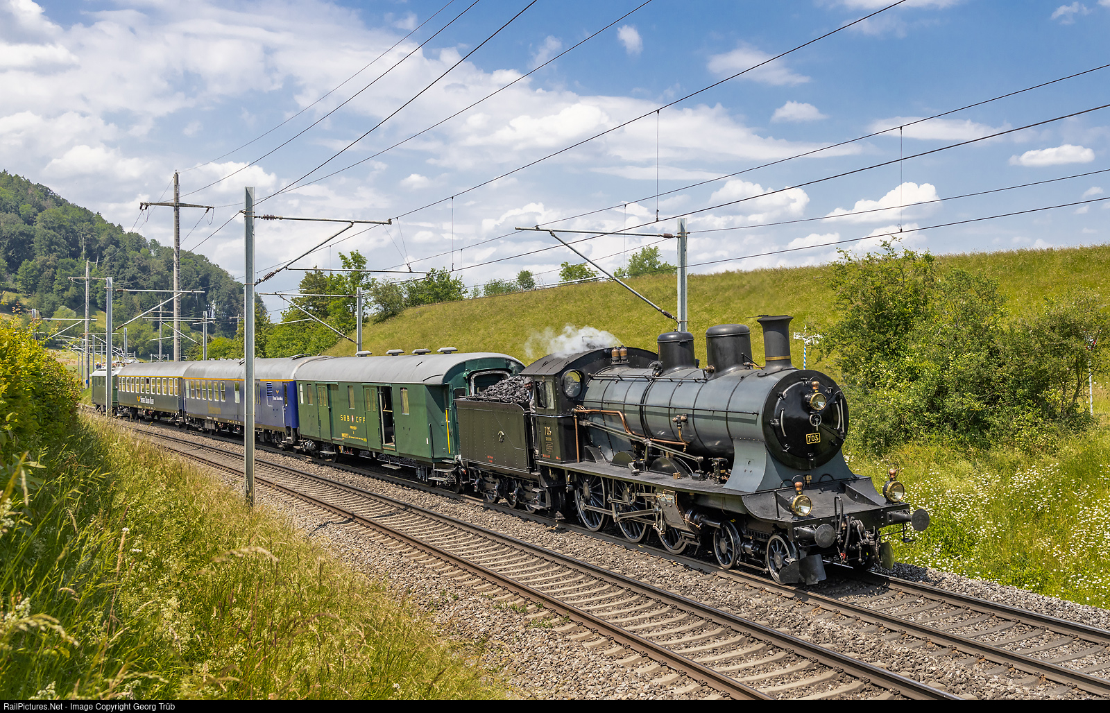 Express train steamlocomotive A 3/5 # 705 of SBB Historic, built in 1904 by the SLM, nowadays on long term loan to the steam group Zürich (Verein Dampfgruppe Zürich VDZ), is on the 0.9 % grade between Eglisau and Glattflelden with train 32880 from Schaffhausen via Eglisau-Bülach-Regensdorf to Brugg AG (and further with electro traction to Oensingen). The train was organized by RailEvent of Frauenfeld and operating under TR TransRail AG. The cars are former SBB baggage car D 51 85 92-43 014-5, now owned by the Oensingen-Balsthal-Bahn (OeBB), bar car "Schützengarten" WGm 56 80 89-80 010-2 and first class Am 56 80 10-40 360-4 of the IRSI AG. In the rear of the train is Re 4/4 # 10039.