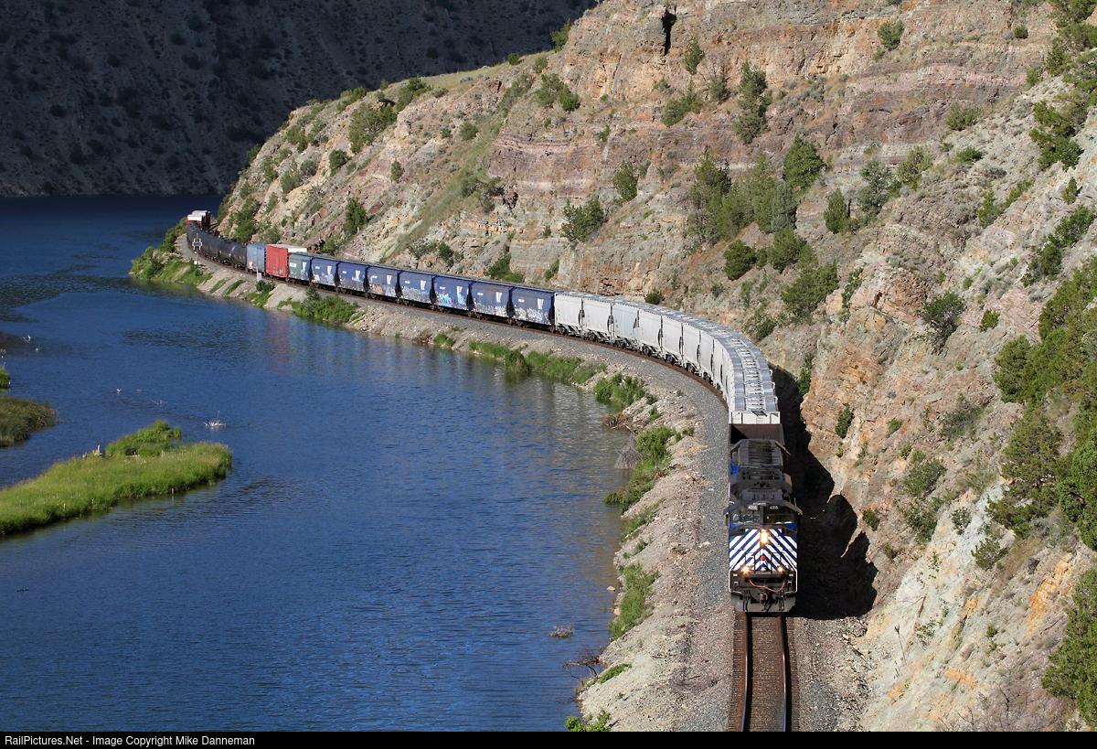 Montana Rail Link’s 840 local, also known as the Helena local, rolls east through Lombard Canyon between Toston and Lombard, Montana, on the afternoon of June 26, 2016. The train is powered by MRL EMD SD70Ace No. 4315 and EMD SD45 No. 382 and is headed for switching at Trident and Logan before returning to Helena.
