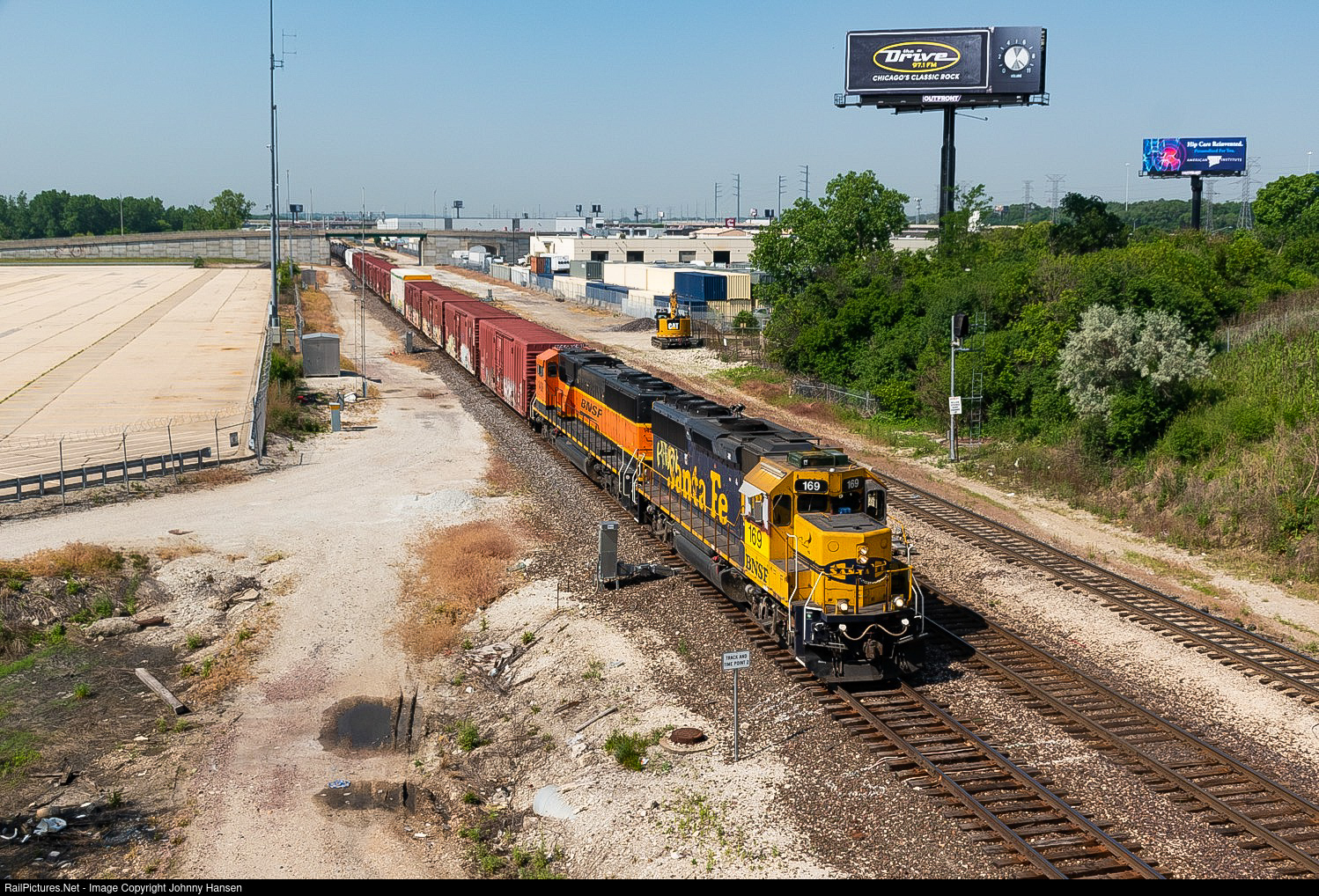 | Chicago’s Classic Rock. Riding along home Santa Fe rails, a early morning M-GALCHI arrives at Hodgkins with GP60 169 leading SD60M 1436, slowly coming to a stop at CP Harbor for preparation to shove onto the GM Yard lead into GM Yard. Myself personally I really enjoyed the billboard with my favorite Chicago radio station in the background. |