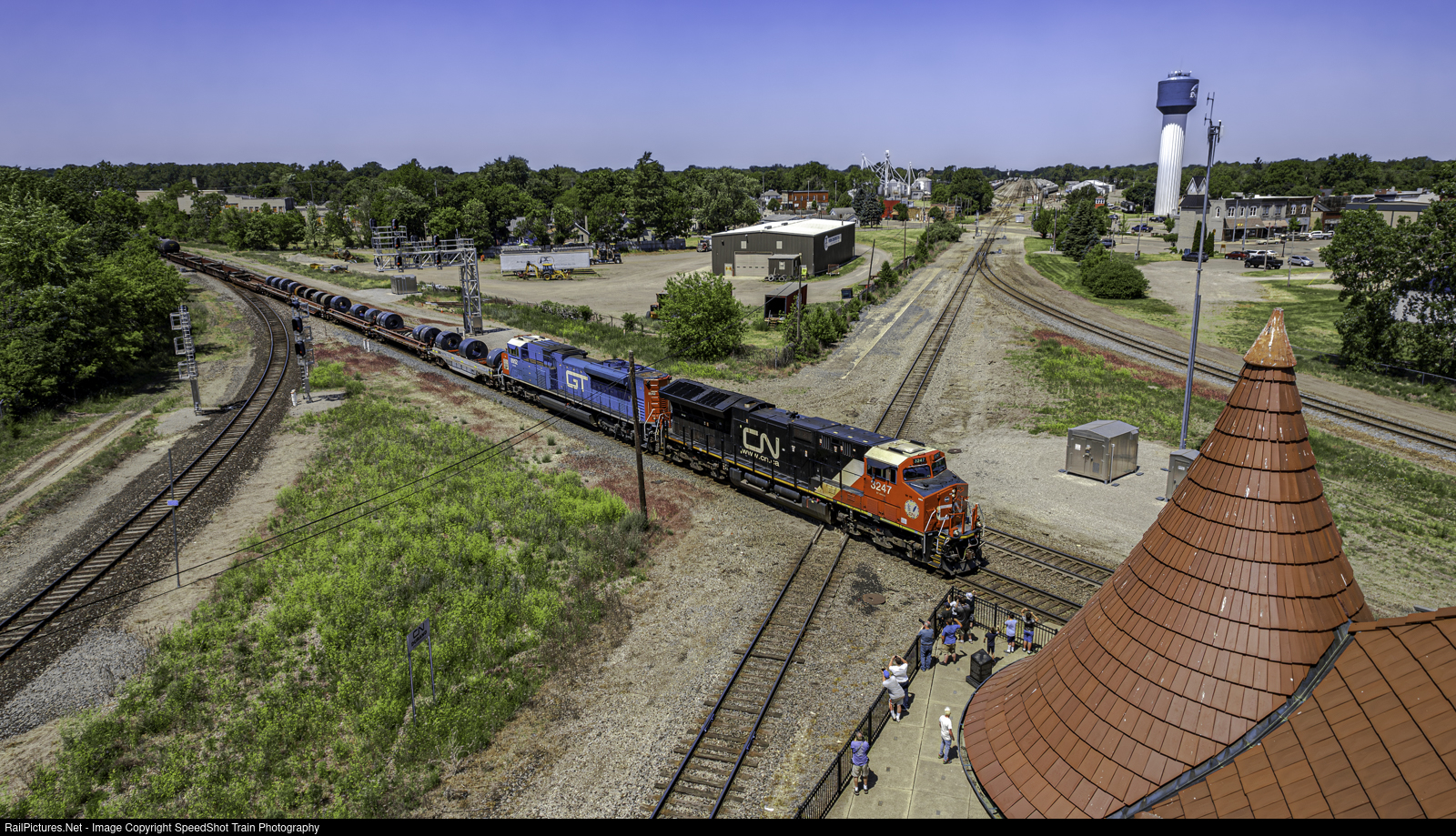 | CN 3247 Leads CN Train #A492 across the diamond in Durand Michigan with the GT Heritage unit 8952 trailing. There is quite the railfan crowd watching at the station. The Michigan Railfan community had a get together for the day with food and good people gathering together. |