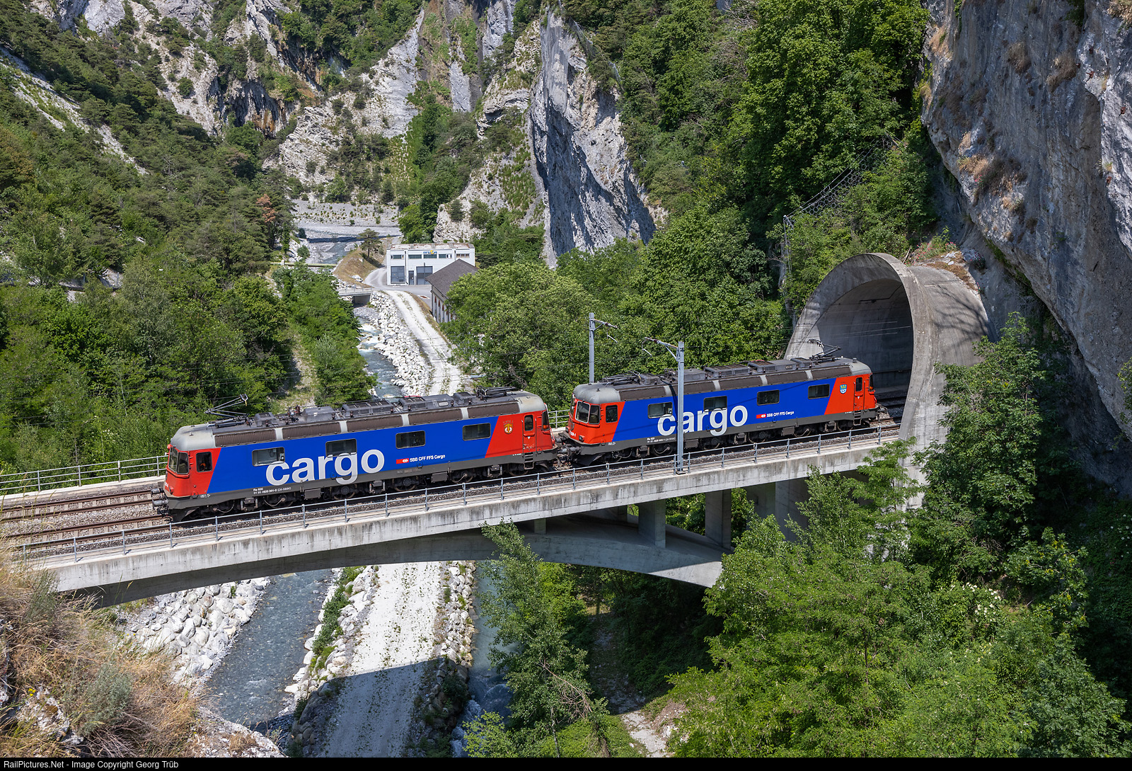 | Re 620 # 081 "Immensee" (Re 6/6 # 11681) and Re 620 # 009 "Uzwil" (Re 6/6 # 11609) are leaving the 1365 meter long Leuk tunnel and crossing the 79 meter long bridge over the Dala gorge between Leuk and Salgesch. The locomotives are running as train 28302 from Brig to Villeneuve, the second locomotive will be uncoupled in Sion. |