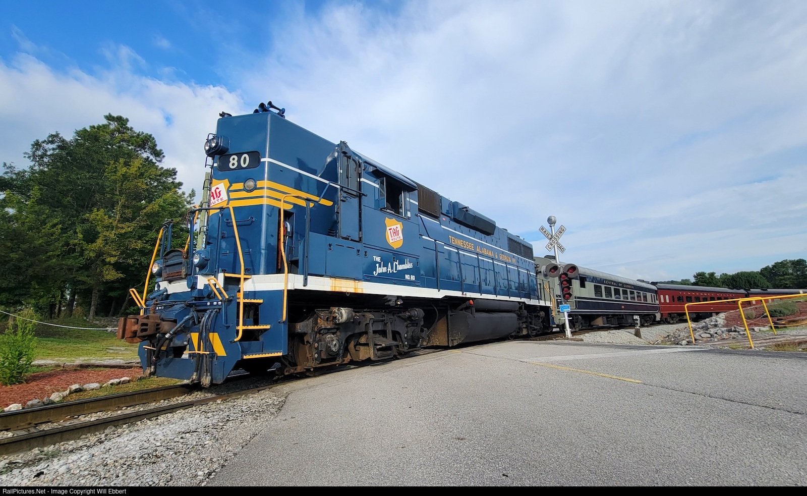 | Not only is TAG 80 one of the best looking diesels at TVRM, it also has a unique history. The locomotive was one of the first GP38s ever built and served as a demonstrator for EMD before going to the Tennessee Alabama and Georgia who named it after John Chambliss. The locomotive was later folded into the Southern, and then NS rosters before going to TVRM. Here the locomotive is seen taking the Missionary Ridge Local around the wye at Grand Junction with engineer Joseph Randall at the throttle. |