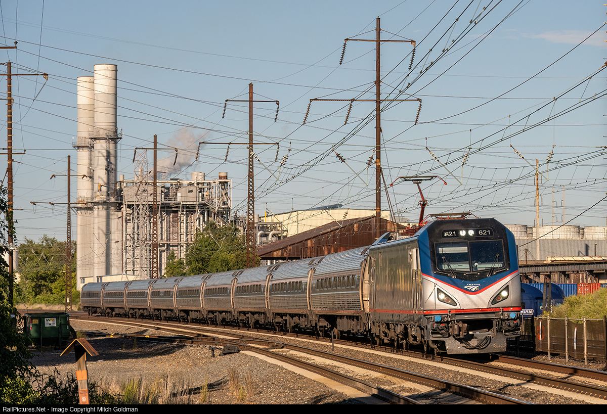 | A southbound Amtrak Regional rounds the bend just past the former Baldwin Locomotive Works (not in view) passing the Liberty Electric Generating natural gas plant in Eddystone, PA. Wilmington is the next stop, eventually terminating in Washington DC. |