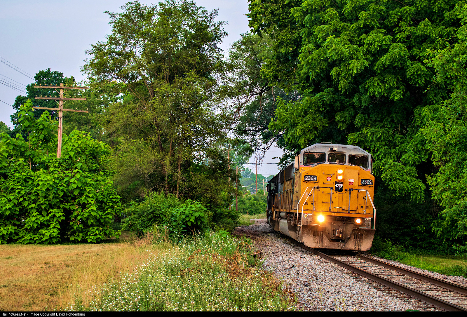 | LTEX SD60M No. 2369 is on the point of the Indiana & Ohio's Washington Court House Turn as it digs into the grade starting their climb up Madeira Hill in Madisonville at sunrise on the Midland Subdivision. Somewhere along the way, the 2369 has "acquired" a quasi-DT&I nose logo. |
